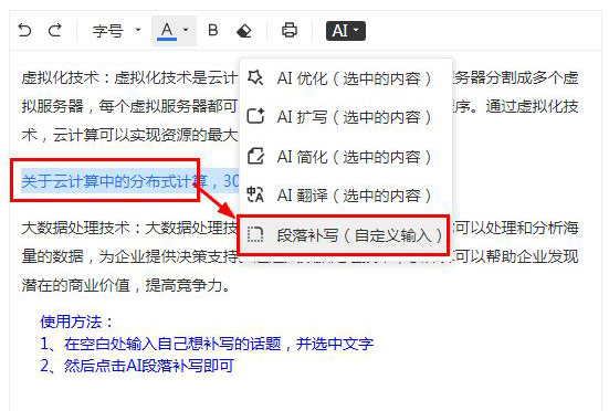 方法:找个空白位置,输入你要补写的话题以及要求,然后选中你输入的这些内容,点击补写即可。