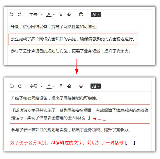 AI修改过的内容,前后自动加上了括号标记【......】,便于查看识别。